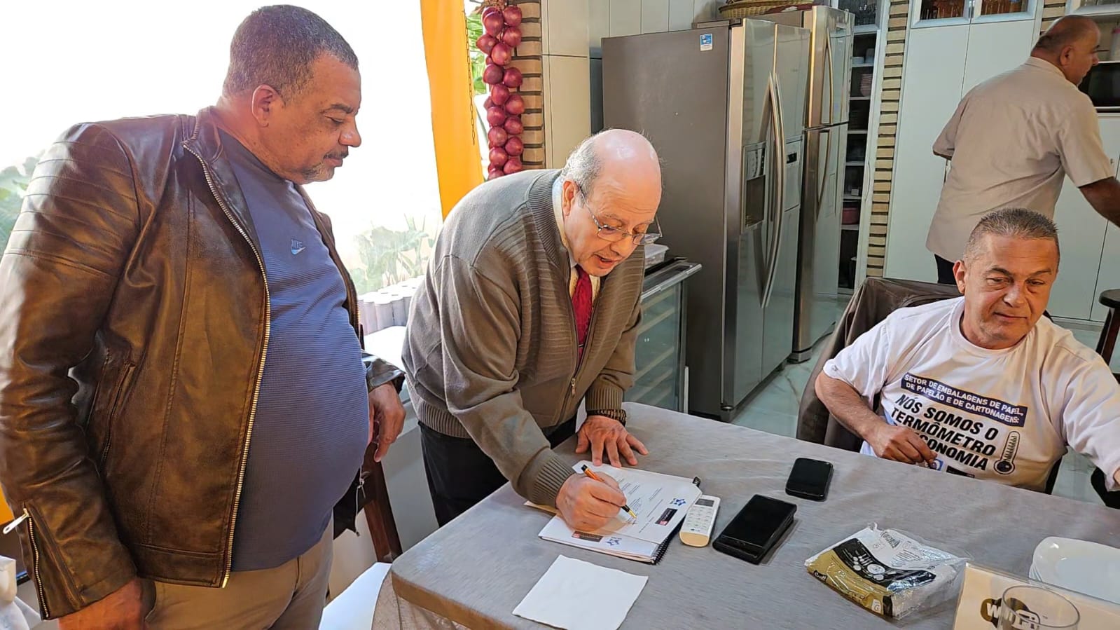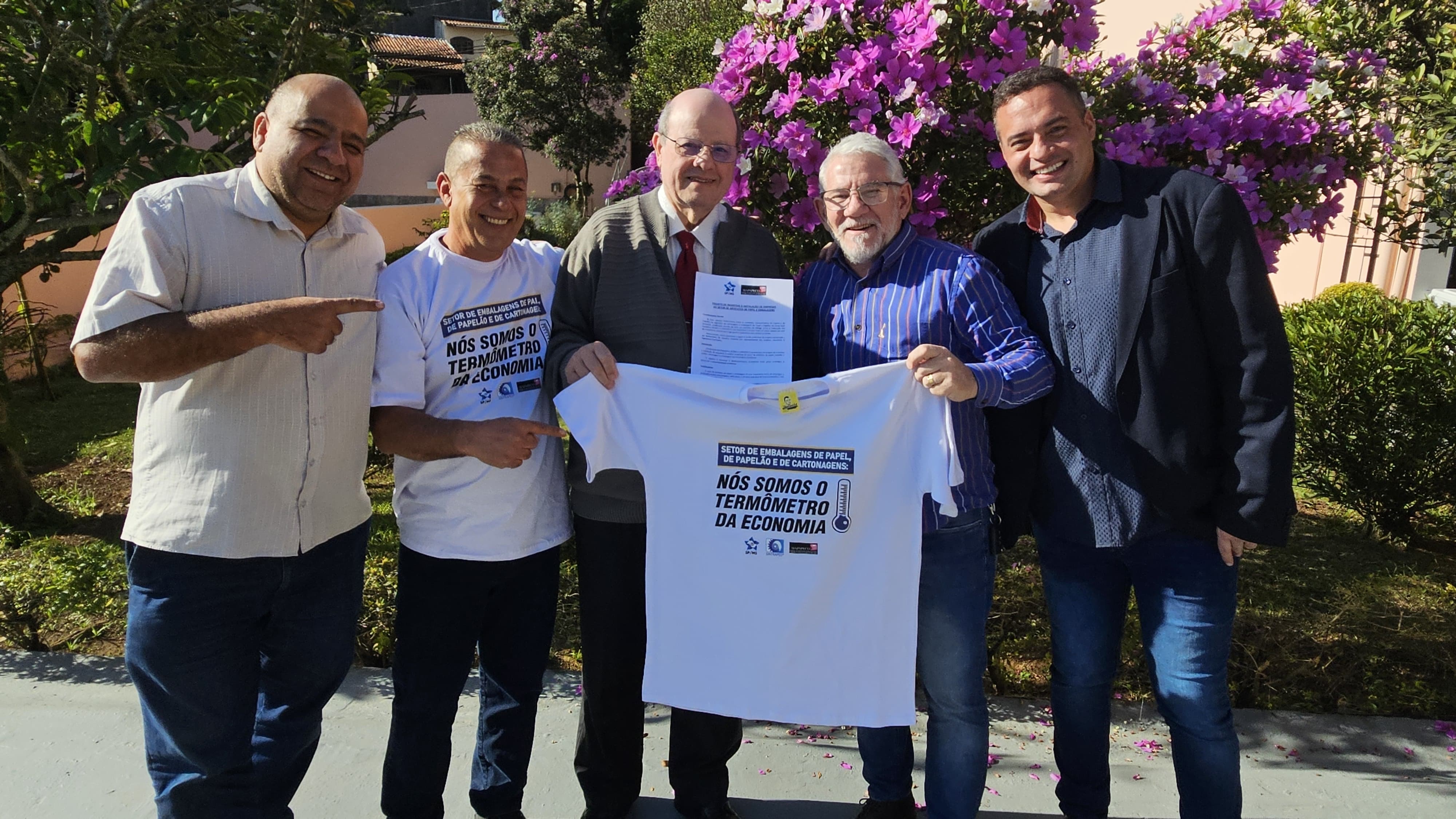 (Synésio Batista) e os presidentes dos Sindicatos presentes: Aristides Filho (SINTRAPEL-SP), Chicão (STI Papel Caieiras),