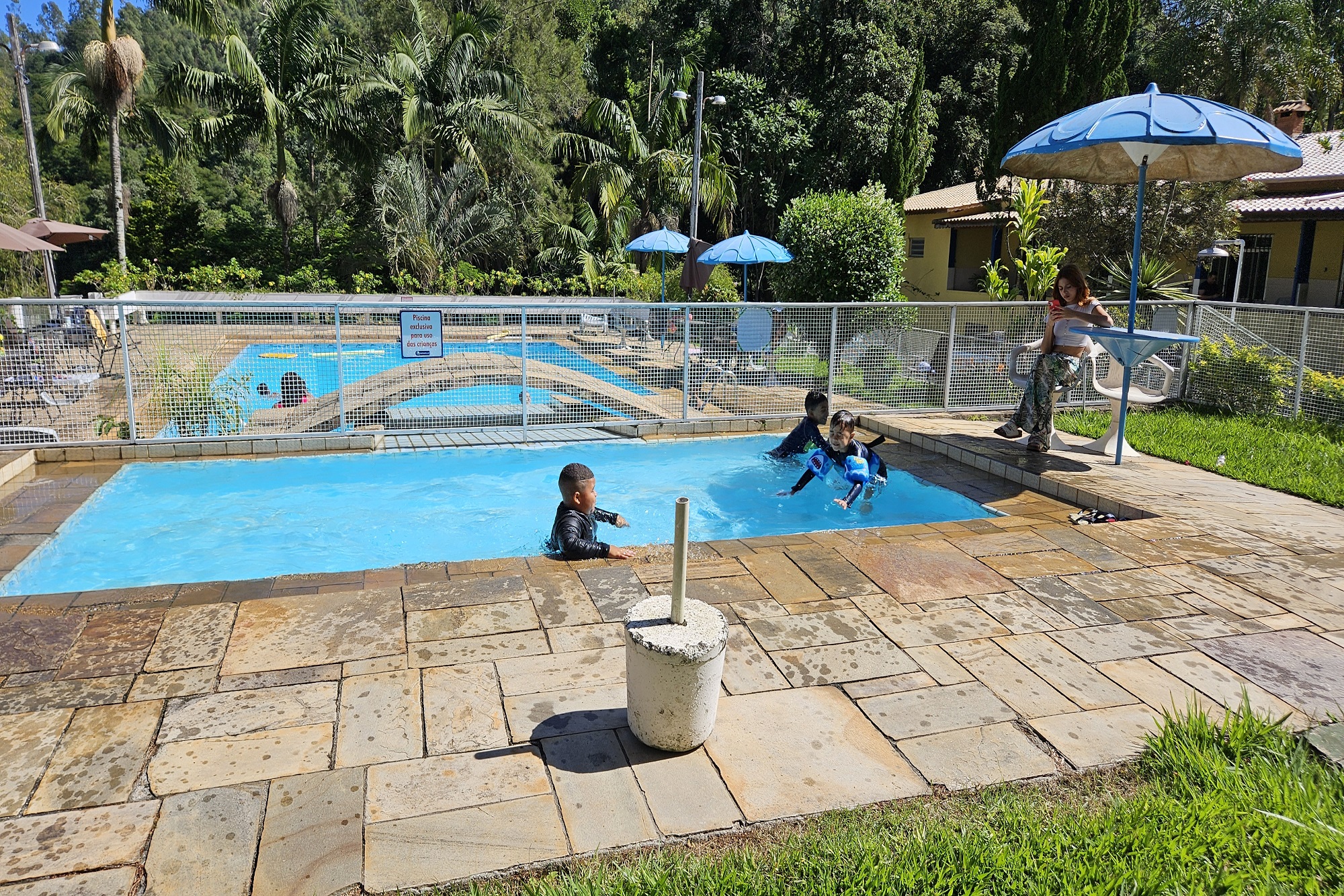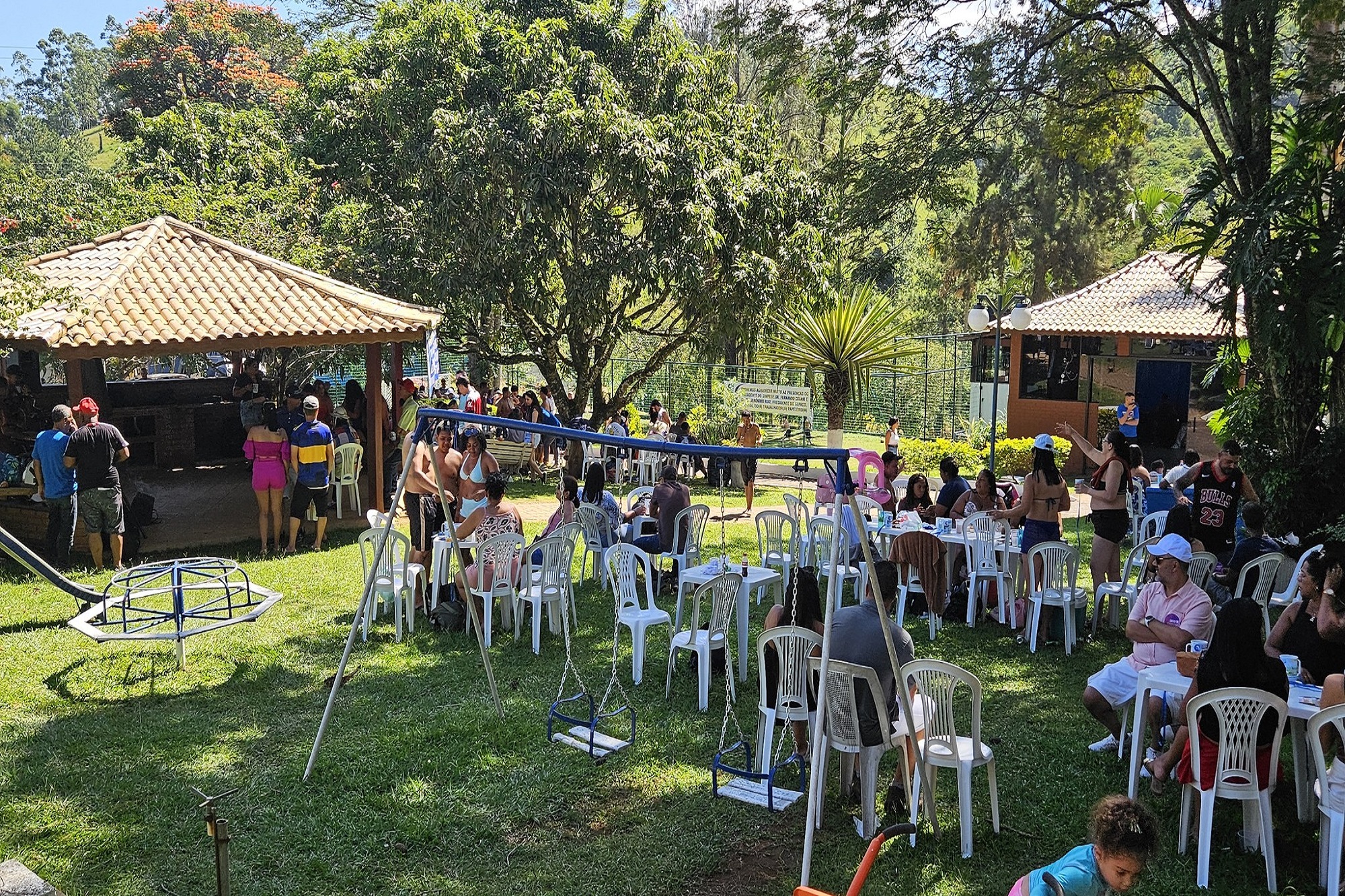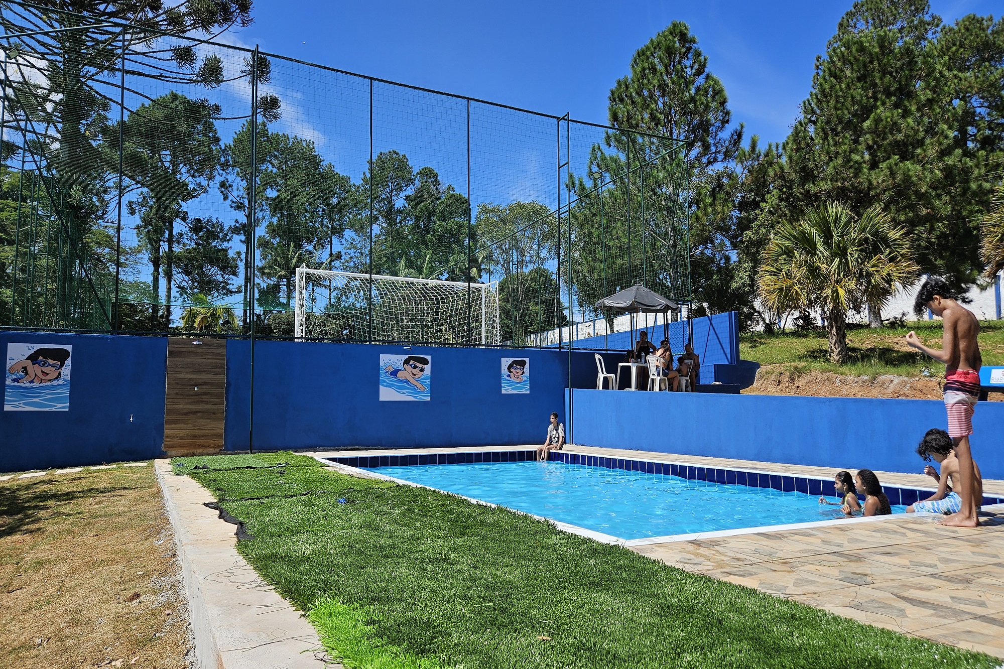 O local conta com chalés, churrasqueiras, campos de futebol society, vestiários, 3 piscinas