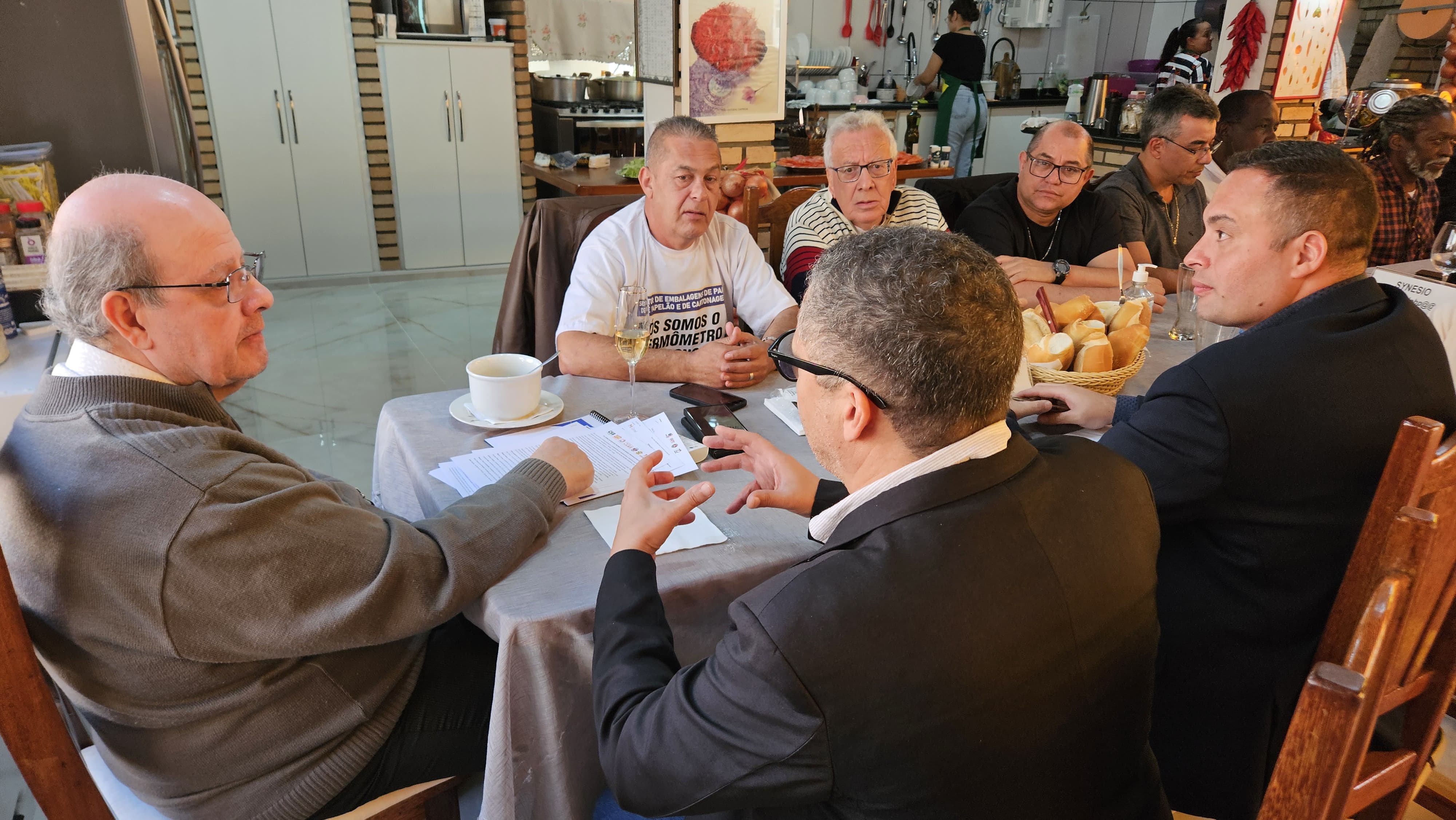 (Synésio Batista) e os presidentes dos Sindicatos presentes: Aristides Filho (SINTRAPEL-SP), Chicão (STI Papel Caieiras),